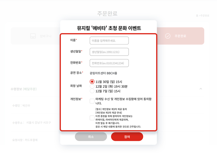 | 주문인 정보 : 이름 , 전화번호 수령인 정보 : 이름 , 전화번호 , 주소(배달주문 시) |
