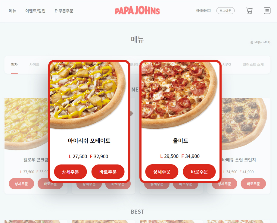 파파존스 피자는 귀하의 정보를 수시 저장하고 찾아내는 ‘쿠키(cookie)’를 사용합니다. 단, 귀하의 정보를 쿠키에 저장하지 않습니다.쿠키란 파파존스 피자의 웹사이트를 운영하는데 이용되는 서버가 귀하의 브라우저(인터넷 익스플로러, 넷스케이프 등)에 보내는 아주 작은 텍스트 파일로서 귀하의 컴퓨터 하드디스크에 저장됩니다. 또한 귀하께서는 쿠키에 대한 선택권이 있습니다. 웹브라우저 상단의 도구 → 인터넷옵션 탭(option tab)에서 모든 쿠키를 다 받아들이거나, 쿠키가 설치될 때 통지를 보내도록 하거나, 아니면 모든 쿠키를 거부할 수 있는 선택권을 가질 수 있습니다. 다만, 쿠키를 거부할 경우에는 로그인이 필요한 서비스를 이용할 수 없습니다.쿠키는 PC의 로그아웃 시에 자동으로 PC에 저장되지 않고 삭제되도록 되어 있으므로 공공장소나 타인이 사용할 수 있는 PC를 사용하실 경우에는 로그인 후 서비스 이용이 끝나시면 반드시 로그아웃을 해주시기 바랍니다.