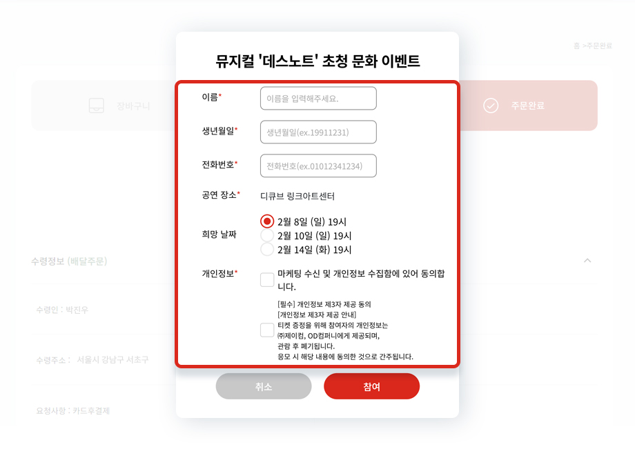 | 주문인 정보 : 이름 , 전화번호 수령인 정보 : 이름 , 전화번호 , 주소(배달주문 시) |