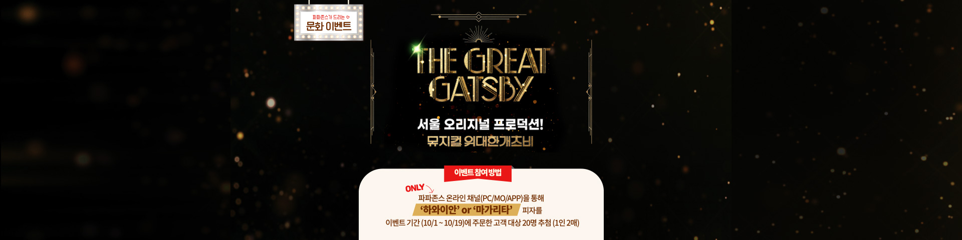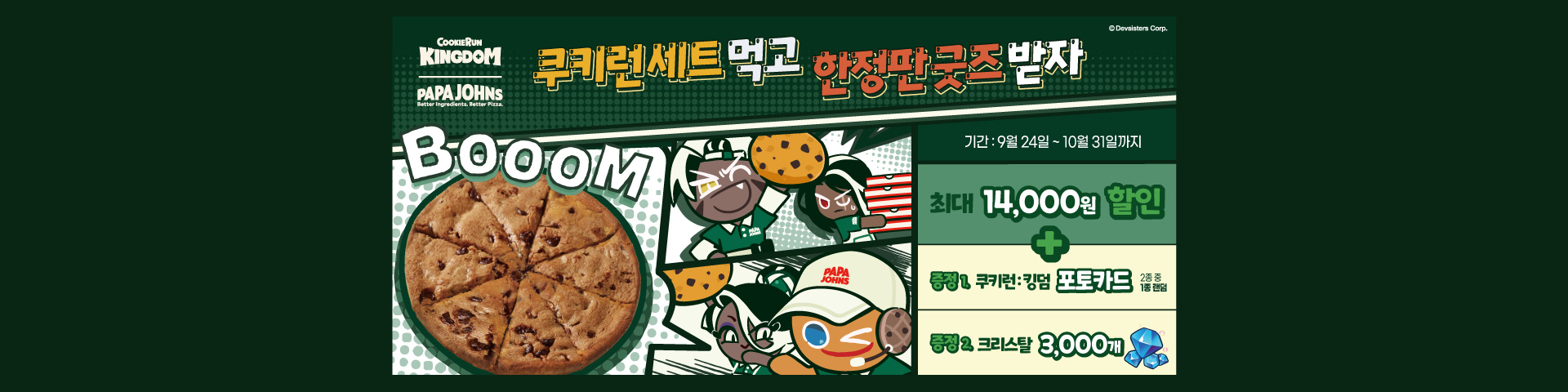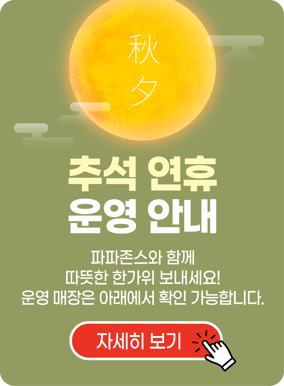 파파존스 피자는 귀하의 정보를 수시 저장하고 찾아내는 ‘쿠키(cookie)’를 사용합니다. 단, 귀하의 정보를 쿠키에 저장하지 않습니다.쿠키란 파파존스 피자의 웹사이트를 운영하는데 이용되는 서버가 귀하의 브라우저(인터넷 익스플로러, 넷스케이프 등)에 보내는 아주 작은 텍스트 파일로서 귀하의 컴퓨터 하드디스크에 저장됩니다. 또한 귀하께서는 쿠키에 대한 선택권이 있습니다. 웹브라우저 상단의 도구 → 인터넷옵션 탭(option tab)에서 모든 쿠키를 다 받아들이거나, 쿠키가 설치될 때 통지를 보내도록 하거나, 아니면 모든 쿠키를 거부할 수 있는 선택권을 가질 수 있습니다. 다만, 쿠키를 거부할 경우에는 로그인이 필요한 서비스를 이용할 수 없습니다.쿠키는 PC의 로그아웃 시에 자동으로 PC에 저장되지 않고 삭제되도록 되어 있으므로 공공장소나 타인이 사용할 수 있는 PC를 사용하실 경우에는 로그인 후 서비스 이용이 끝나시면 반드시 로그아웃을 해주시기 바랍니다.